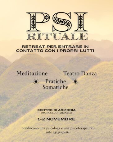 Retreat Meditazione, Teatro Danza e Pratiche Somatiche 1-2 Novembre 2025 Un’esperienza, un ritiro, che parla piano, ma ci auguriamo risuoni forte dentro di te. Hai mai pensato al LUTTO nella … Continua a leggere