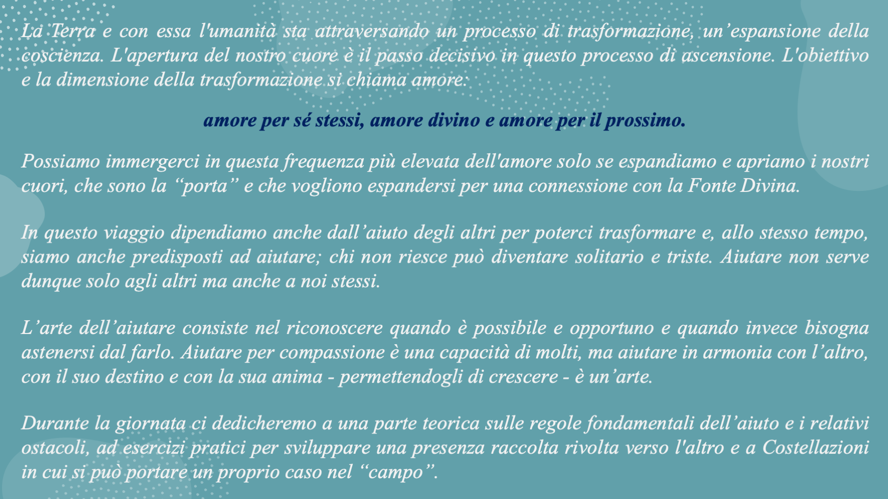 nei quali si daranno strumenti per chi già si occupa di “porgere aiuto” e per chi lo desidera da sempre.